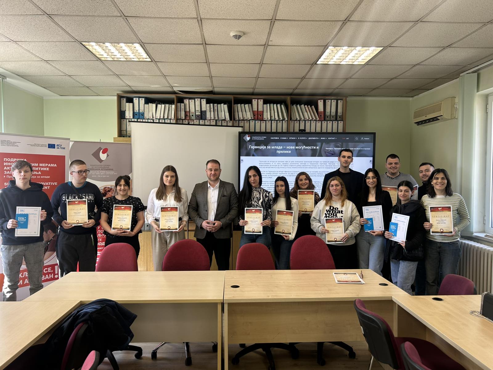 У просторијама филијале Крушевац Националне службе за запошљавање 19. марта додељени су сертификати за полазнике који су успешно завршили онлајн кратке курсеве по програму „Гаранција за младе“ ИПА 2020.