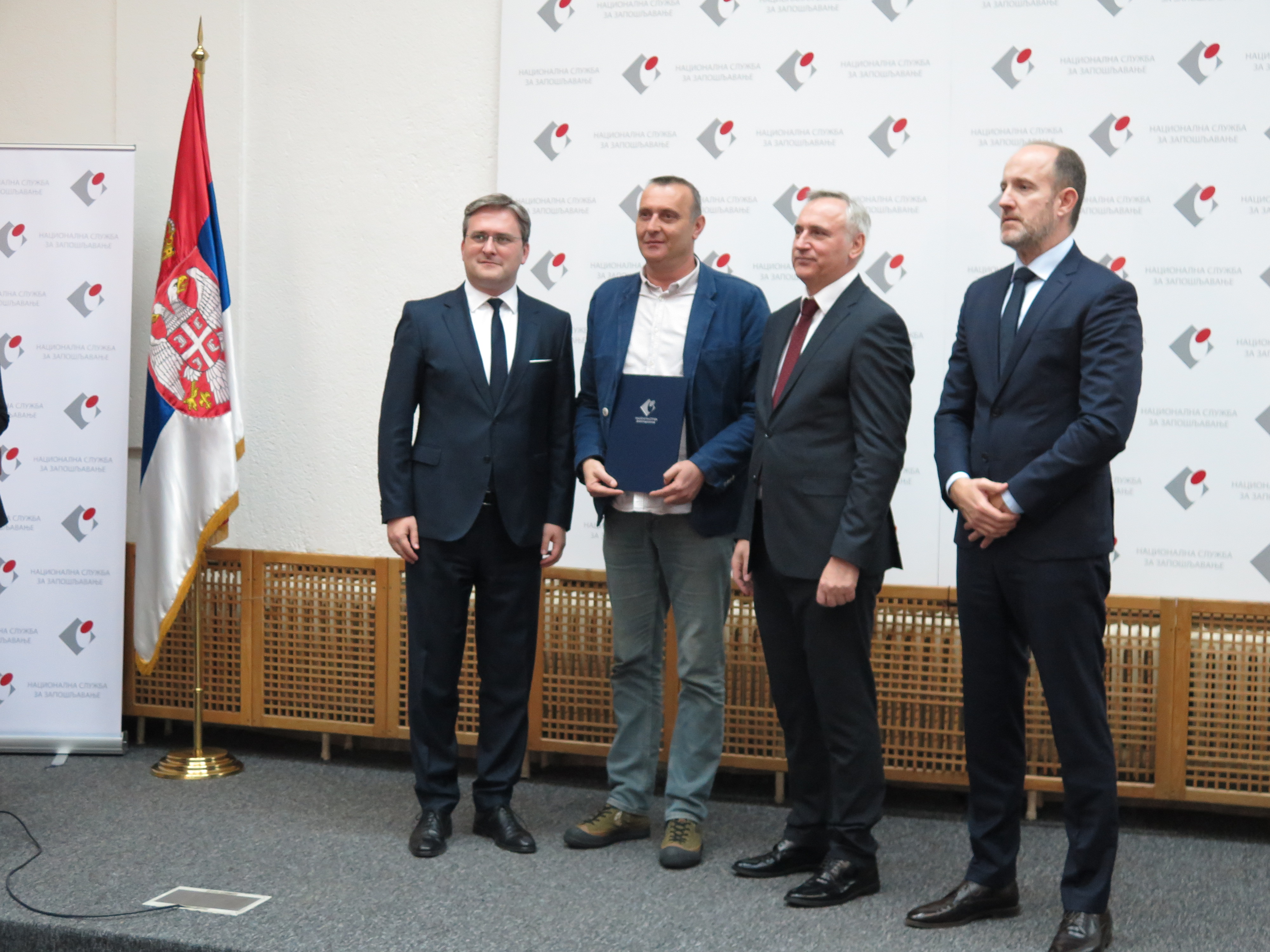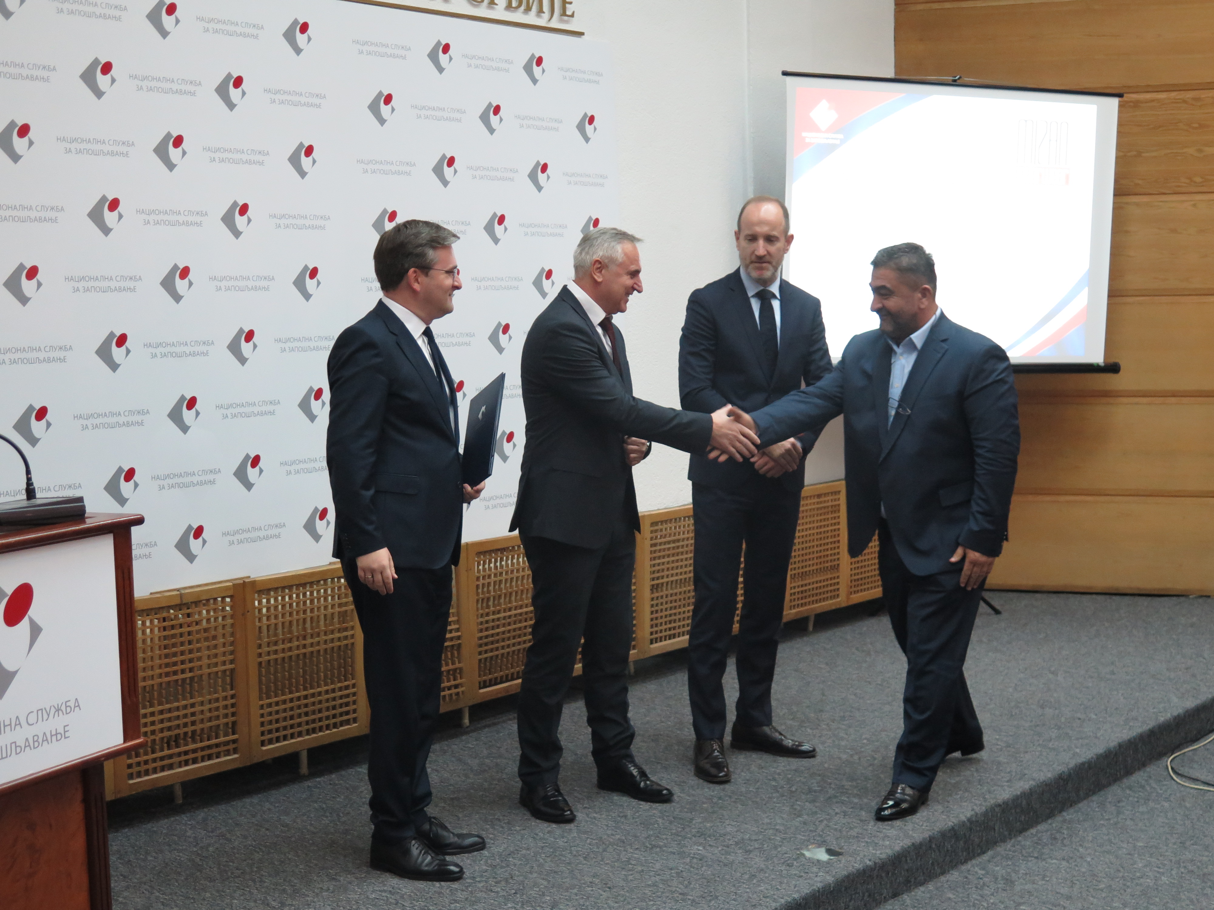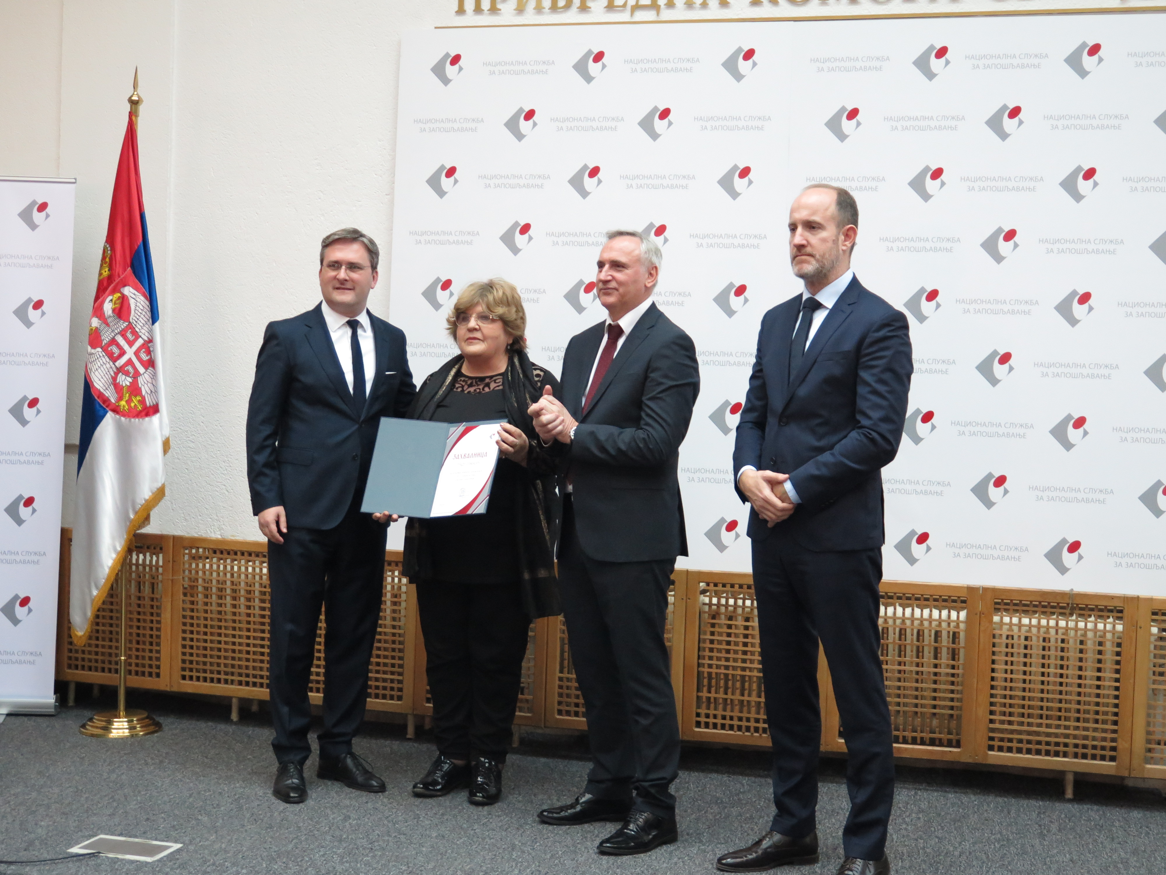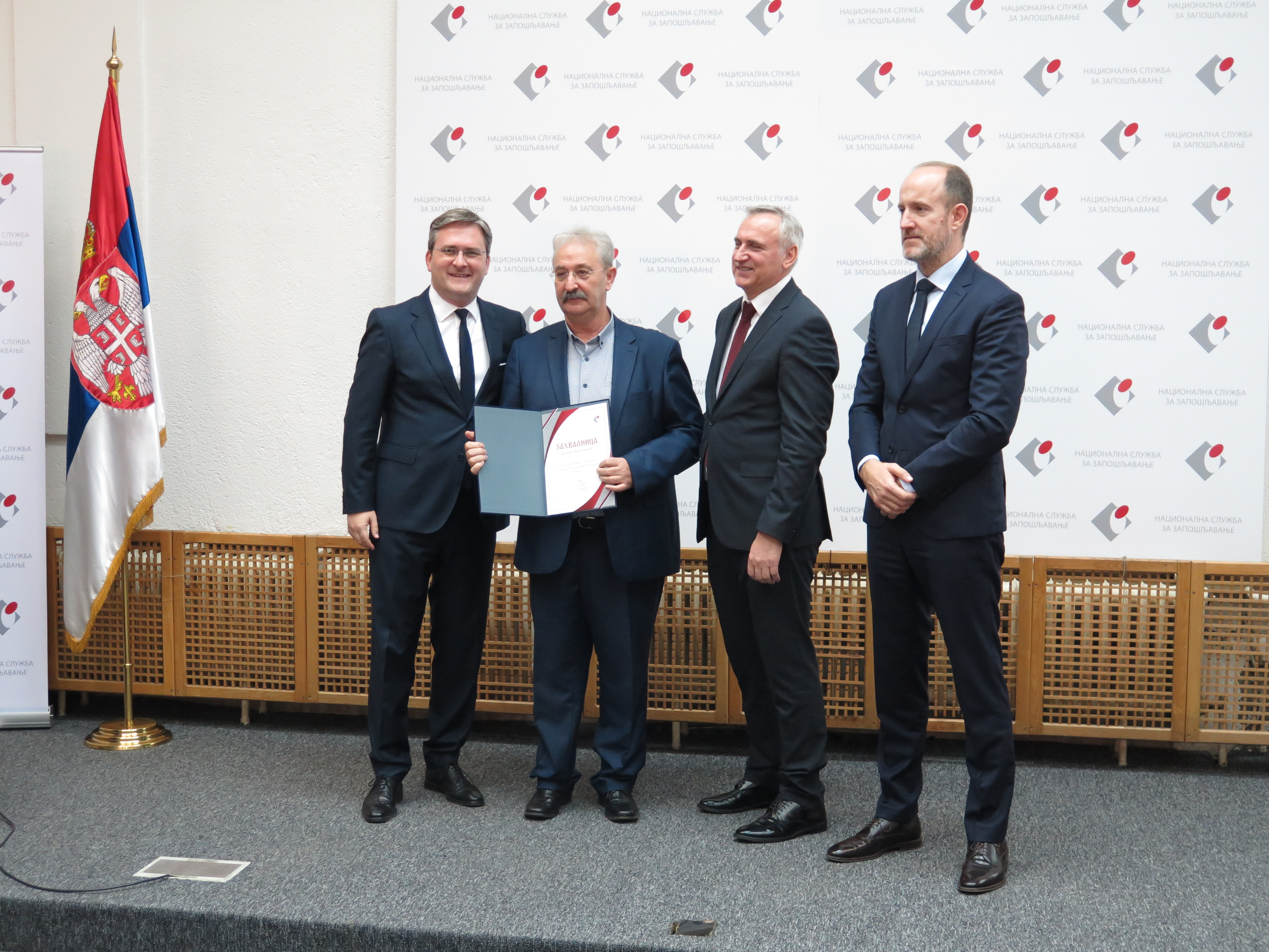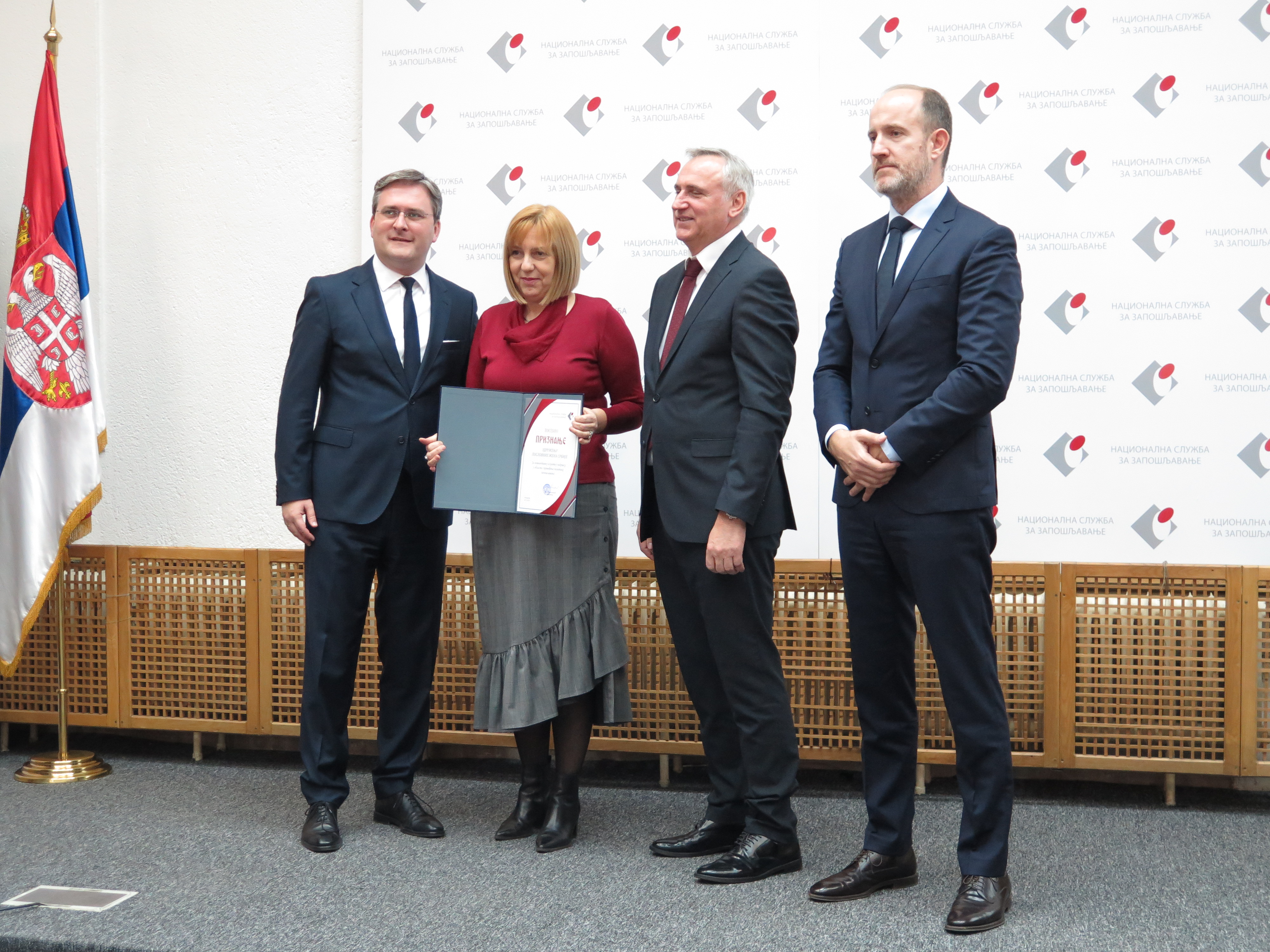 Награда за послодавца са којим је НСЗ остварила најинтензивнију сарадњу на локалном тржишту рада додељена је компанији МИЗАН ЛИНЕ ДОО из Новог Пазара; За посебан допринос запошљавању у области женског предузетништва захвалницу је добило предузеће ХЕЉДИНО ЗРНО ДОО из Кутња код Лепосавића; признања за партнере који су НСЗ пружили изузетну подршку у области спровођења политике запошљавања додељена су УДРУЖЕЊУ ПОСЛОВНИХ ЖЕНА СРБИЈЕ и САВЕЗУ ЗА ЦЕРЕБРАЛНУ И ДЕЧИЈУ ПАРАЛИЗУ СРБИЈЕ; захвалница послодавцу који је запослио највећи број особа са инвалидитетом користећи услугу посредовања у запошљавању НСЗ уручена је ДРУШТВУ ЗА ТРГОВИНУ И УСЛУГЕ ЕXПОРТ-ИМПОРТ ФЕХЕР И ОСТАЛИ ДОО из Хајдукова; Захвалница за предузетника који је основан уз финансијску подршку НСЗ - субвенцију за самозапошљавање и уз наставак сарадње са НСЗ остварује успешно пословање додељена је СТУЗР “РАЈИНАЦ ГРИЛЛ ПРЕРАДА И КОНЗЕРВИСАЊЕ МЕСА” из Бајмока; за посебан допринос унапређењу рада филијала НСЗ у Прокупљу и Новом Саду захвалницама су награђене колеге Жарко Стојановић и Душан Марјановић; Захвалницама су награђени и градови ЛЕСКОВАЦ, СОМБОР и ПРОКУПЉЕ као локалне самоуправе које су у овој години дале највећи допринос запошљавању.