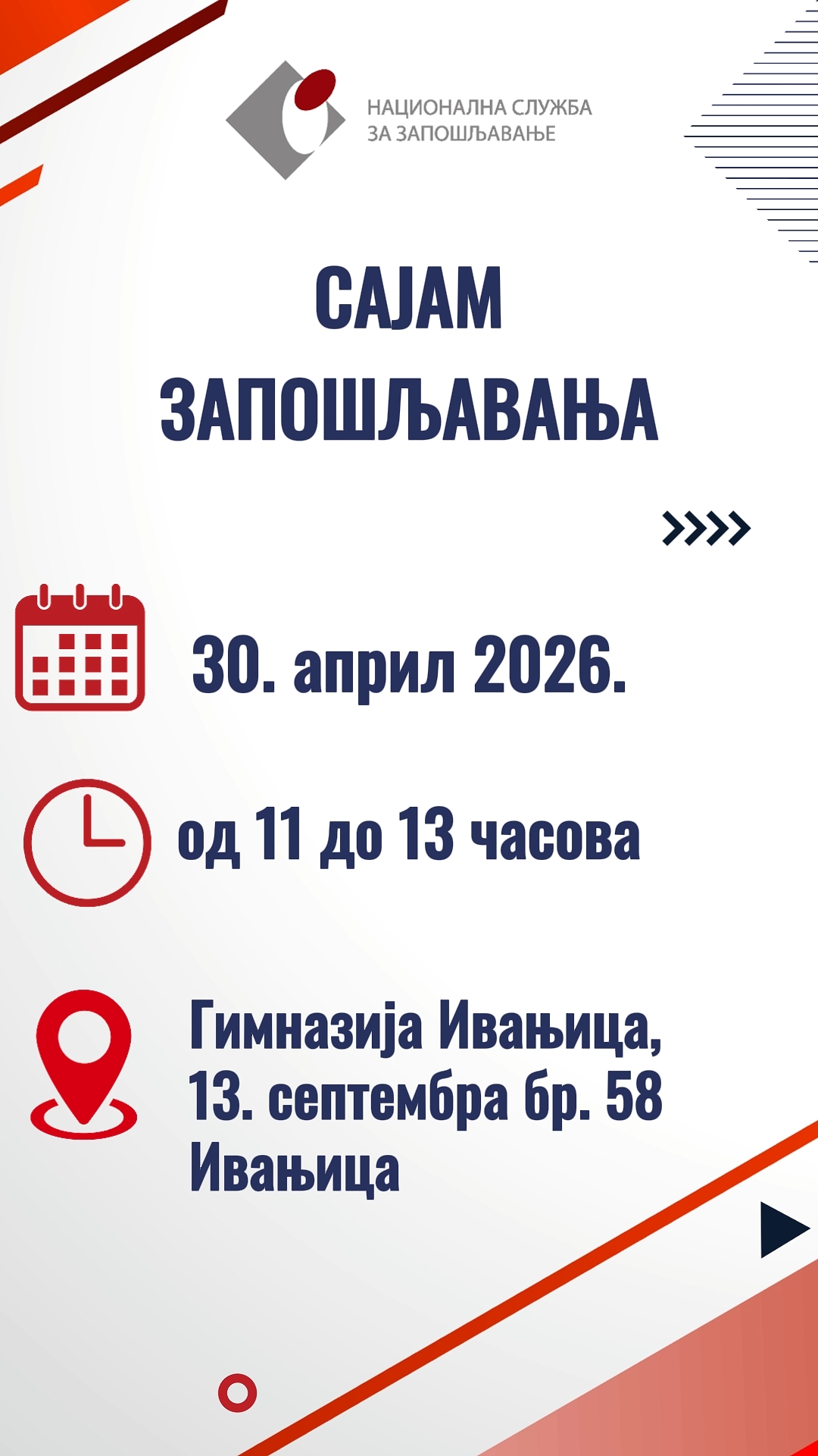 Испостава Ивањица чачанске Филијале Националне службе за запошљавање позива послодавце и незапослена лица на Сајам запошљавања у Ивањици, који ће бити одржан 30. априла, од 11 до 13 сати, у сали Гимназије, на адреси 13. септембар бр. 58.