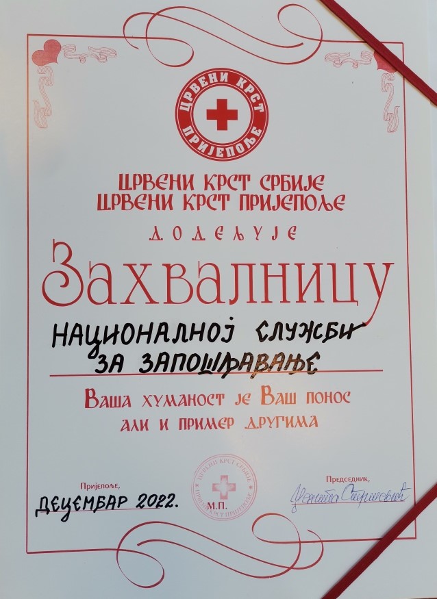 У уторак 7. фебруара одржана је трећа овогодишња акција добровољног давања крви. Toм приликом у знак захвалности за успешну сарадњу Црвени крст Србије/Црвени крст Пријепоље, доделио је Захвалницу НСЗ филијали Пријепоље. Директорки филијале Пријепоље Рафети Хајдаревић Захвалницу је уручила секретар Црвеног крста Пријепоље, Ивана Пушица и захвалила се за несебично уступање простора за потребе добровољног давања крви, изразивши наду да ће се сарадња са Националном службом за запошљавање – филијалом Пријепоље, наставити и у наредном периоду.