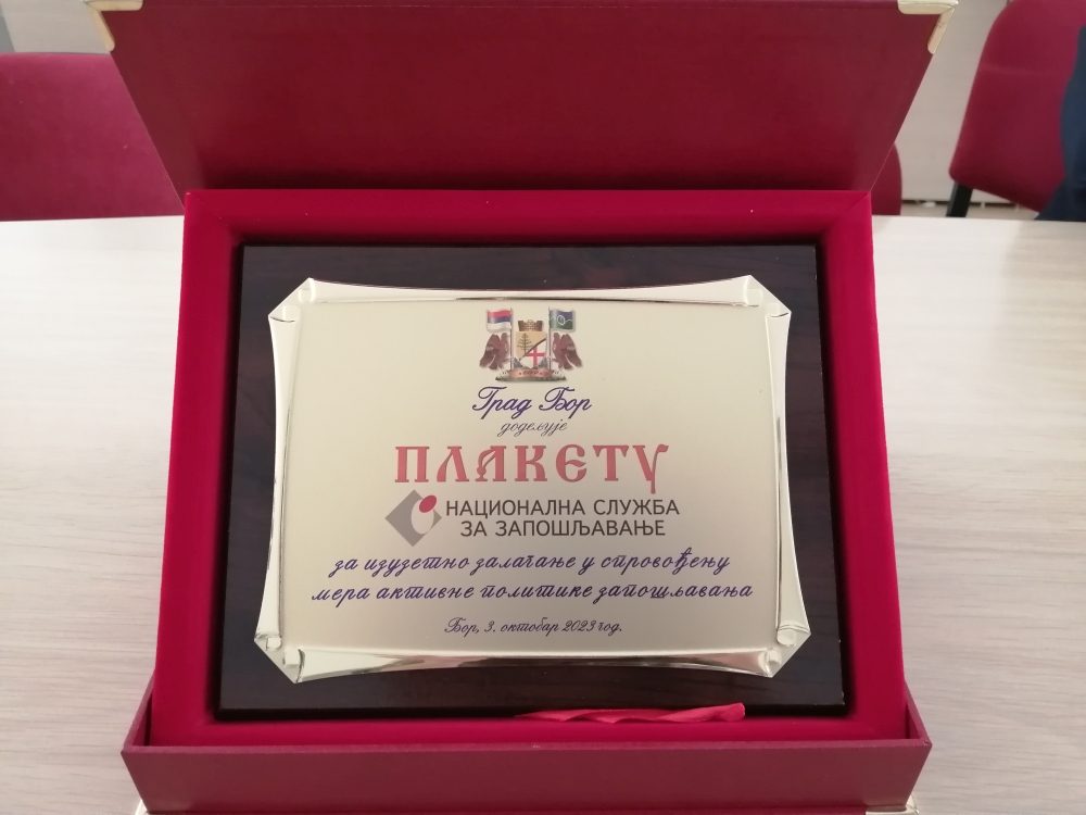 „Захваљујући одличној сарадњи са Националном службом за запошљавање, град Бор је добитник признања за допринос запошљавању кроз мере активне политике запошљавања“, наглашено је у закључку приликом уручивања Плакете.