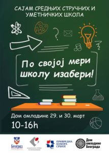 Овогодишњи дводневни Сајам средњих стручних и уметничких школа биће одржан у Дому омладине Београда, под слоганом „По својој мери школу изабери“, 29. и 30. марта, од 10 до 16 сати. На великом београдском сајму професионалне оријентације, намењеном ученицима основних школа, своје образовне програме представиће 40 средњих стручних и уметничких школа са територије града Београда.