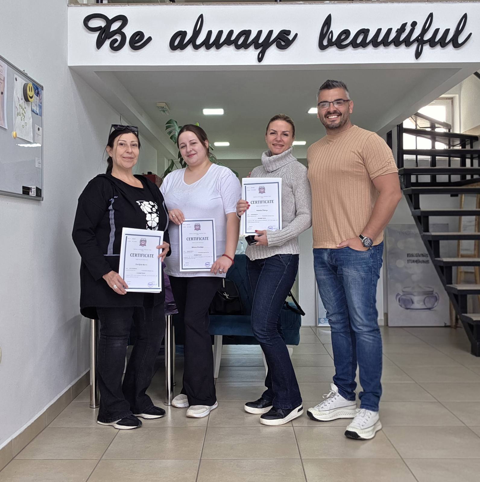 У просторијама зрењанинског козметичког салона и едукативног центра „Be Always Beautiful“ уприличена је додела сертификата незапосленима који су преко Националне службе за запошљавање успешно завршили обуку за козметичаре.