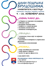 Универзитет у Београду - Центар за развој каријере и саветовање студената и Центар за студенте са хендикепом организују „Дане подршке бруцошима“, од 9. до 21. новембра 2016. године, са циљем да се помогне студентима прве године у сналажењу на факултету, са новим обавезама, у новој улози, у новом граду.